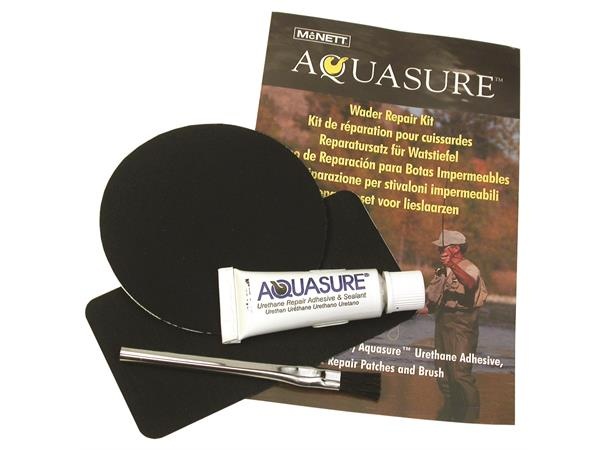 Le kit de réparation comprend un mini tube de 7 grammes d’AquaSure, un pinceau pour appliquer une fine couche de colle, et deux patchs qui peuvent être collés sur la fuite ou utilisés du côté opposé (waders).