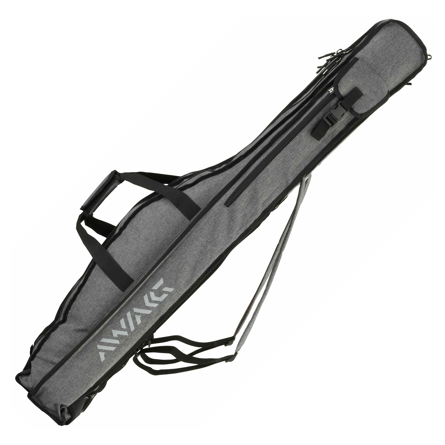 Ce fourreau durable offre un espace sécurisé pour trois cannes montées. La grande poche avant peut accueillir un parapluie ou d'autres accessoires. Les bretelles rembourrées et la poignée assurent un transport facile, tandis que le fond caoutchouté protège contre l'humidité. Œillets en haut et en bas pour un rangement suspendu.