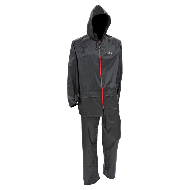 Combinaison de pluie DAM Protec, noire. Combinaison de pluie légère en deux pièces en tissu extérieur solide 65 % polyester/35 % PVC.