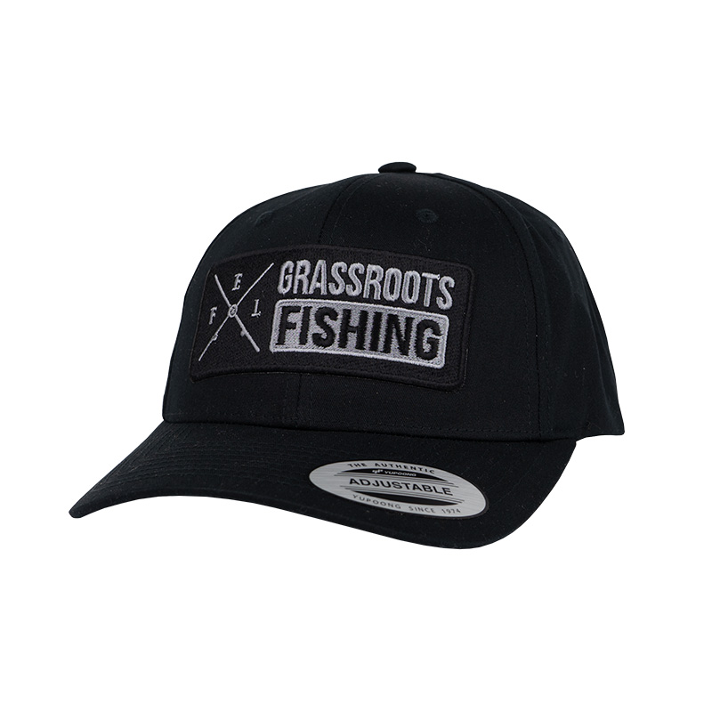 Snapback Yupoong noir avec visière incurvée et patch brodé, design élégant.