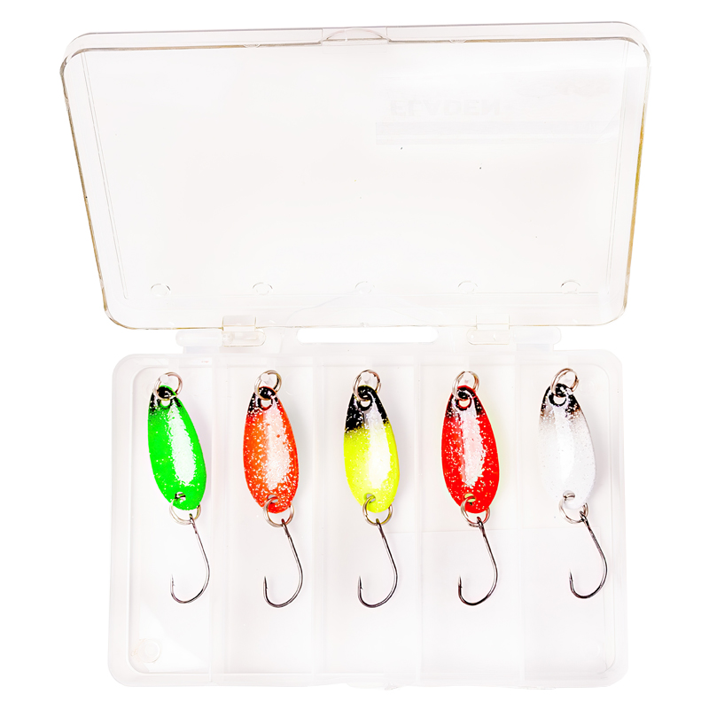 Fladen Conrad Mini Spoon Assortment (5-pack) - 3g 30mm est un pack de 5 leurres cuillères avec boîte à appâts associée. Petits leurres cuillères avec hameçons simples dans un emballage pratique pour la pêche des poissons précieux !