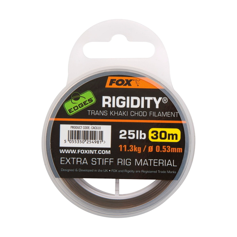 Chod filament verkrijgbaar in trans kaki 25lb/0.53mm & 30lb/0.57mm, extra stijf rig materiaal op 30m spoelen.