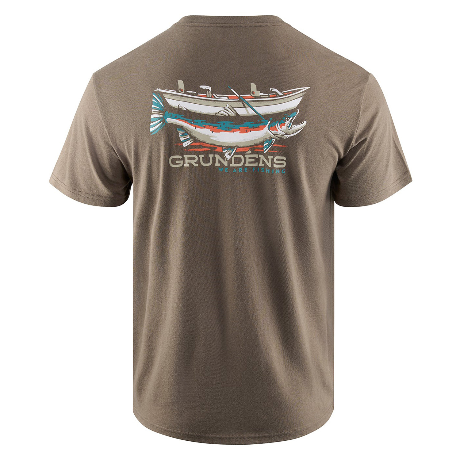 Le Grundéns Drift Boat SS T-Shirt capture la magie de la pêche en rivière avec un design exclusif de barque dérivante et de truite géante.