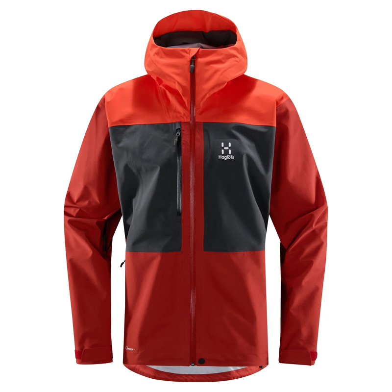 Haglöfs Front Proof Jacket Men Habanero/Corrosion - Un ciel couvert sur le sentier de randonnée ? Avec cette veste coquille légère et emportable, ce n'est pas un problème. Elle est fabriquée à partir d'un tissu durable en polyester recyclé PROOF™ à trois couches avec une finition lisse et une membrane recyclée qui offre une protection respirante contre les intempéries. La ventilation sous les manches vous aide à rester à l'aise lorsque vous êtes en mouvement. Il est également doté d'une capuche réglable et d'un ensemble de poches à main zippées pour les mains froides ou les en-cas.