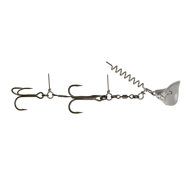 La tête RockerHead se remplace facilement par un plomb classique : il suffit de placer le lest sur l’agrafe, puis de fixer celle-ci à la vis. Le montage stinger est armé d’hameçons BKK 6062-1X-NP SS, connus pour leur piquant durable et leur fiabilité sur les poissons combatifs.