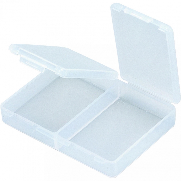 Petite boîte de Meiho avec compartiments séparés. L'étui à mini-compartiments Meiho Rectangle FB-2 est un récipient en plastique transparent qui comprend 2 petits compartiments de rangement avec des couvercles à charnière individuels attachés.