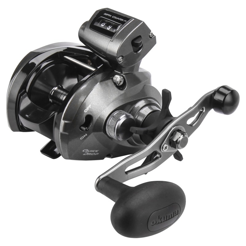 Moulinet de pêche à la traîne à profil bas avec fonction intelligente Quick Drop Switch. Lorsqu'il est allumé, appuyez sur la barre de pouce pour libérer la bobine. Laissez la pression sur la barre du pouce et la bobine est réengagée. Tout simplement génial.