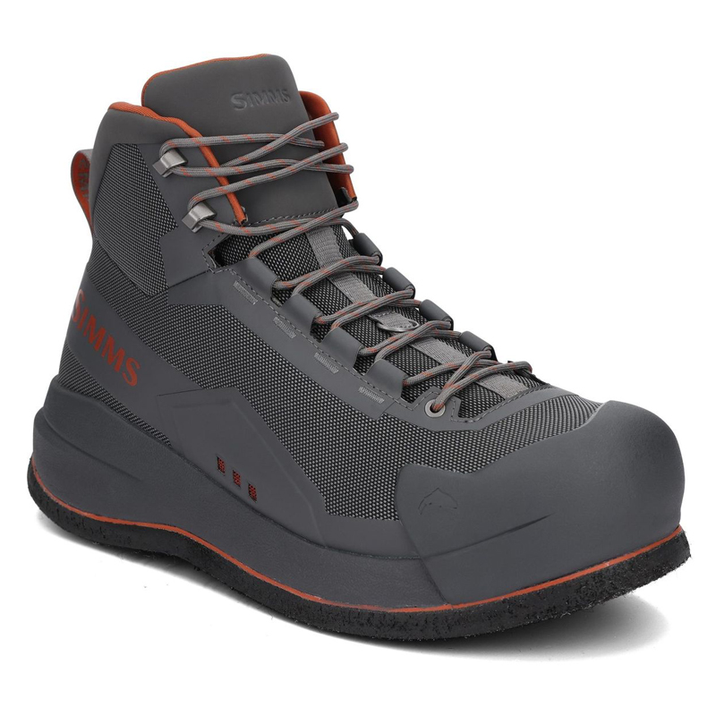 Les Simms Flyweight Boot Felt sont conçues pour les pêcheurs recherchant confort, durabilité et performance. La tige en matériau synthétique tissé à base de TPU est légère et résistante, avec des renforts en caoutchouc sur les orteils et des panneaux anti-abrasion pour protéger contre l’usure. La semelle intermédiaire en EVA double densité offre un confort et une stabilité remarquables. La semelle extérieure Vibram Idrogrip avec Traction Lug assure une adhérence optimale sur les surfaces glissantes. Les trous de drainage empêchent l’eau de stagner, et la semelle est compatible avec les crampons Simms Hardbite et Alumibite.