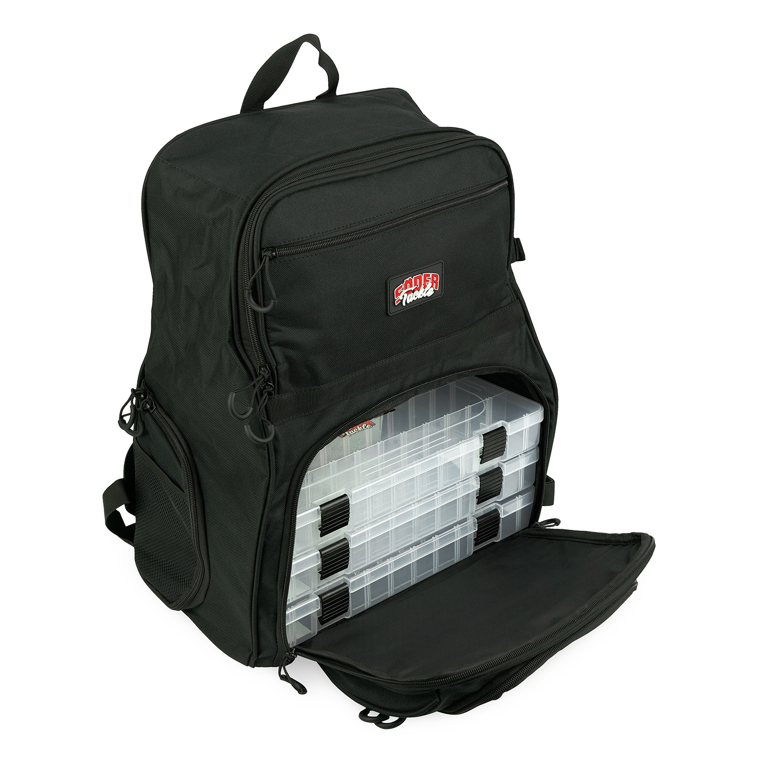 Ce grand sac à dos de pêche comprend deux compartiments principaux et est fourni avec trois boîtes à leurres de taille 3700, avec un espace pour quatre boîtes au total dans le compartiment inférieur. L’extérieur du sac dispose de deux petites poches pour les accessoires et le matériel de bas de ligne. Les côtés sont équipés d’un porte-pince, d’une poche en filet, d’un support de canne et d’une petite poche pour les accessoires. À l'avant, un système MOLLE permet de fixer des accessoires supplémentaires.