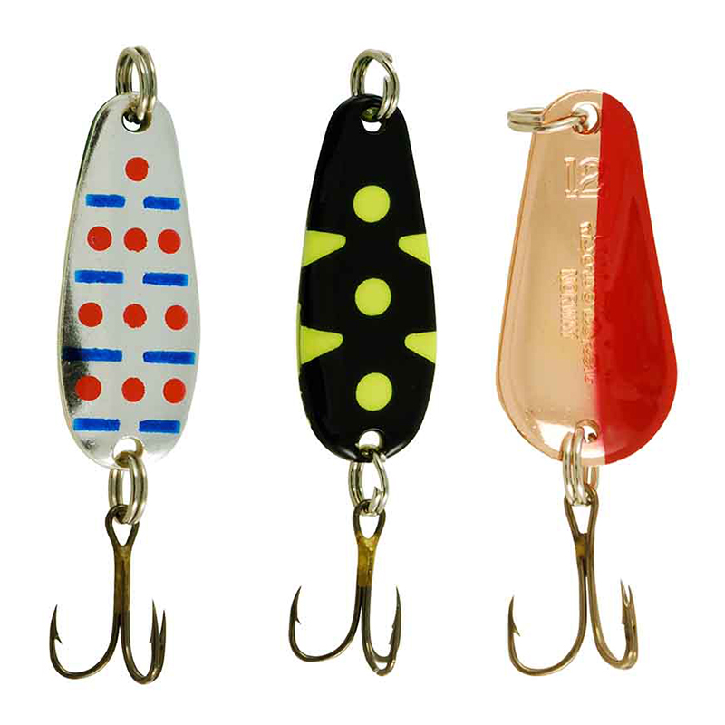 Ce set réunit trois cuillers métalliques pensées pour décider truite, omble et perche, même quand les poissons deviennent méfiants. Le modèle rouge/cuivre en 7 g est un grand classique pour prospecter rivières, lacs et zones peu profondes. Les finitions contrastées travaillent sur les reflets et les silhouettes pour déclencher les touches dans les eaux claires comme teintées.