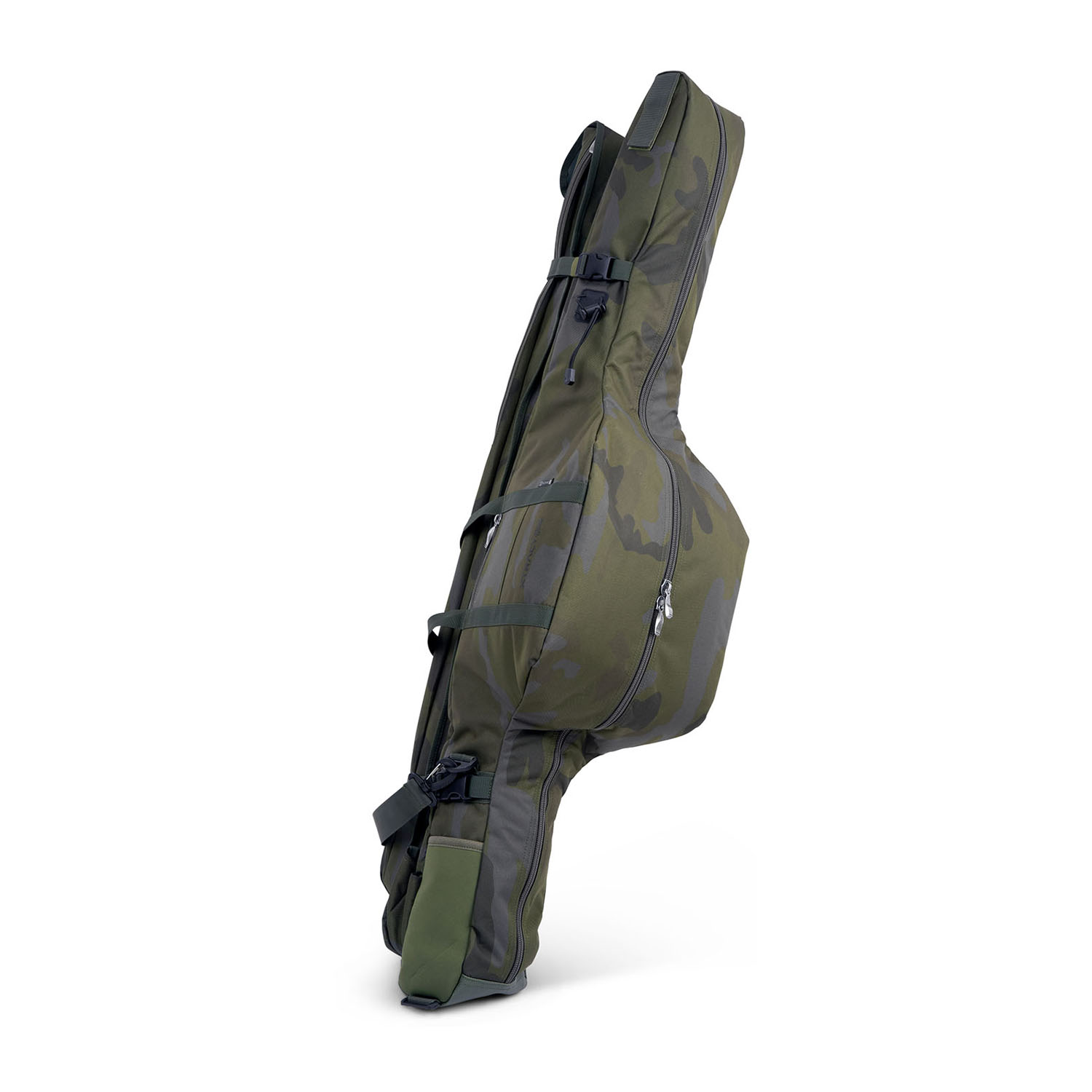Fourreau compact pouvant accueillir 2 ou 3 cannes carpe à talon rétractable, avec grandes poches, sangles et bandoulière rembourrée. Idéal pour transporter un ensemble complet avec épuisette et accessoires.
