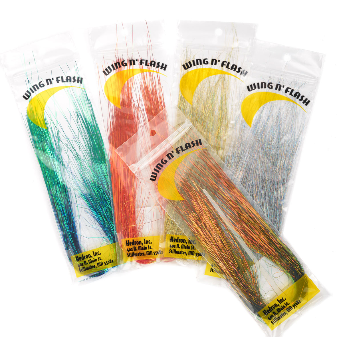 Wing N Flash est un flash très fin utilisé pour toutes sortes de mouches, mais surtout pour les streamers, les mouches côtières et les mouches à saumon ou à truite de mer. Semblable à un flash similaire, mais plus solide et plus souple, il n'entrave pas le mouvement de l'aile dans l'eau comme le font d'autres matériaux.