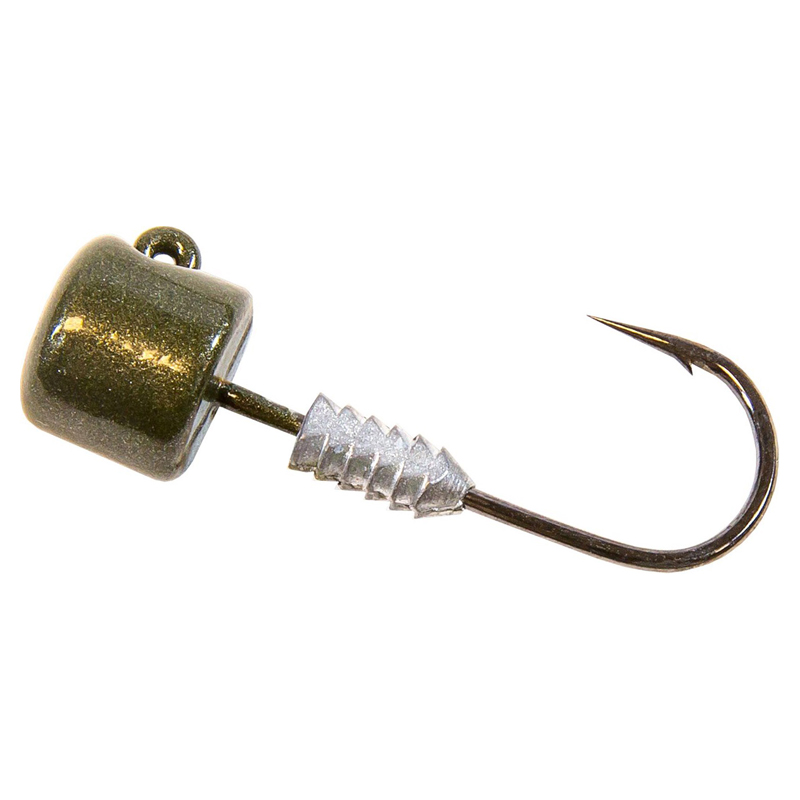 CARACTÉRISTIQUES • Tête en forme de champignon signature préférée des amateurs de finesse • Mustad® robuste UltraPoint® crochets • La conception du support fendu est facile à gréer et maintient ElaZtech®. et les plastiques souples conventionnels en toute sécurité • Disponible en poids de 1/15, 1/10, 1/6 et 1/5 once dans les finitions citrouille verte et noire • 5 têtes plombées par paquet